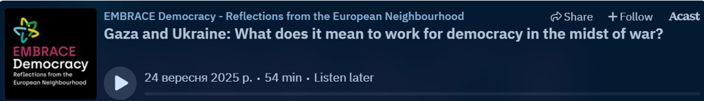 took place on June 25, 2025, took place online. The expert community discussed the research results gathered by the UESA team within the EMBRACE project. In the first presentation, Dr. Tetiana Kyseliova highlighted lessons learnt from the Minsk process concerning the inclusion of civic society representatives into the peace negotiations, stating the sensitive nature of such practices for the peace deal and peace deal implementation in the society. In the second presentation Dr. Dmytro Koval and the UESA young researcher Andrii Latsyba focused on cases of the judiciary reform and NABU creation as two case studies on enhancing democratic institutions in Ukraine to test the concepts of opening and blockages to the democratisation reforms in Ukraine, discussing NABU being described as the positive outcome after the revolutionary events in Ukraine and the judiciary reform being described as having rather mixed achievements with a tendency to failure. Dr. Roman Petrov addressed the involvement of external actors in the domestic scene as forces that were supporting the democracy development in the country or opposing the democratisation processes. The event was moderated by Dr. Oksana Holovko-Havrysheva, the UESA President.