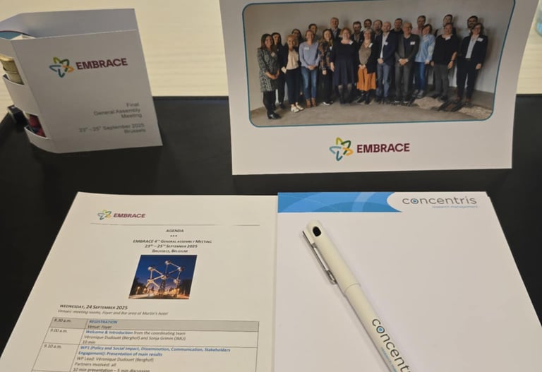 On 23-24 September 2025, the final conference of the EMBRACE project took place in Brussels, Belgium. Participants of the EMBRACE consortium met to discuss results and to present major findings of the project. On the first day of the event 2 thematic workshops took place (North Africa regional policy and EMBRACE scenario-building workshop). On the second day research teams of all 9 WPs presented results of their work and communicated them to representatives of expert community, sister projects and EU decision-makers. The overall results of the EMBRACE project were positively received and acknowledged by the participants and the beneficiaries.