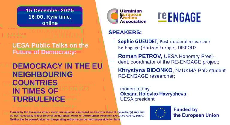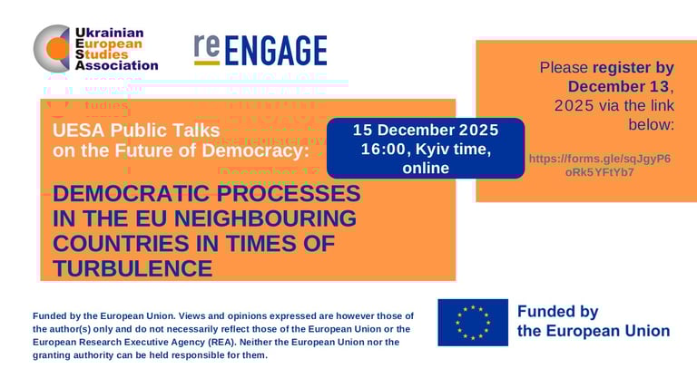 The UESA cordially invites you to participate in our series UESA Public Talks on the Future of Democracy with experts of the RE-ENGAGE project. The registration is open till December 13, 2025, via the link https://forms.gle/sqJgyP6oRk5YFtYb7. The access to the event will be provided to registered participants after the expiration of the registration date.