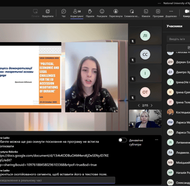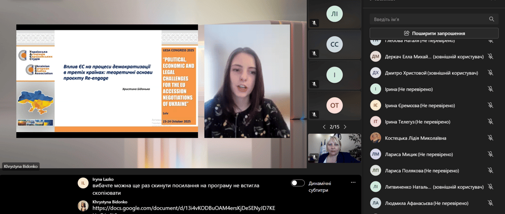 На Конгресі UESA 2025 експерти з усієї Європи зібралися, щоб обговорити політичні та безпекові виклики розширення ЄС. У своїй доповіді Христина Бідонко (Українська асоціація європейських студій) на спеціальній пленарній сесії, присвяченій різним аспектам проекту RE-ENGAGE, представила теоретичні основи досліджень у проекті RE-ENGAGE щодо впливу ЄС на демократизацію в третіх країнах. У своїй презентації вона підкреслила роль ЄС у просуванні демократичних цінностей та належного врядування за межами своїх кордонів.