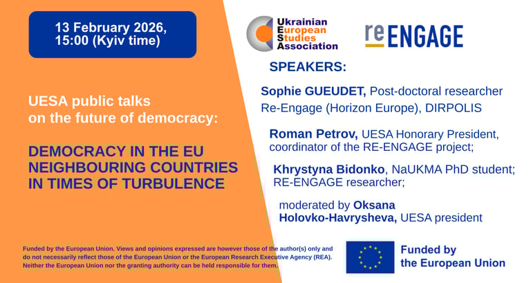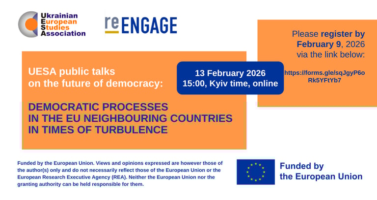 Шановні колеги запрошуємо до нашої серії розмов про майбутнє демократії разом з експертами проєкту RE-ENGAGE. Реєстрація до 12 лютого 2026 р. за посиланням: https://forms.gle/sqJgyP6oRk5YFtYb7. Доступ до заходу буде надіслано зареєстрованим учасникам після завершення реєстрації.